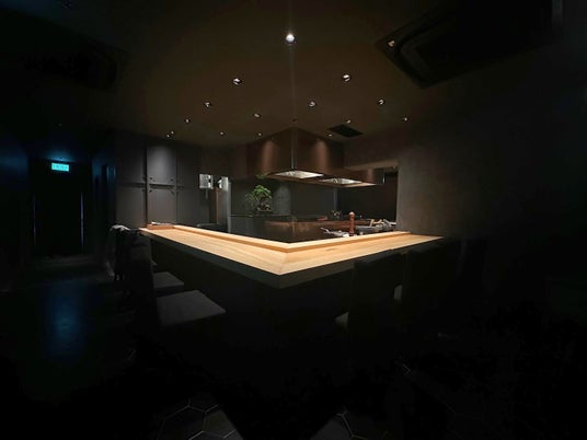 白木のカウンターが浮かび上がり、非日常を演出する「鳥カミ シンガポール店」