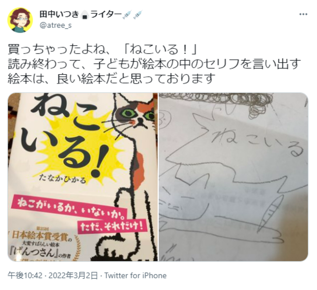 「たなかひかるさん作、『ねこいる!』娘に読んであげたらリピートの嵐! 面白かったです」
