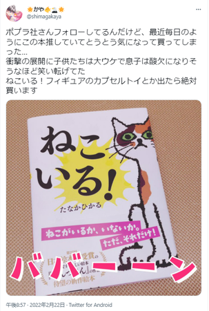 世界で3本だけの『ねこいる!』仕様の「ピーヒャラ」。当選者から絵本の感想と歓喜の声が届いた。