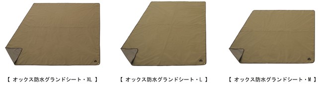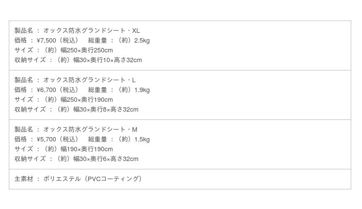 ペグで固定できるほか、PVCコーティング採用で防水性・機能性にも優れた「オックス防水グランドシート」シリーズ3サイズを、アウトドアライフでぜひともご活用ください。