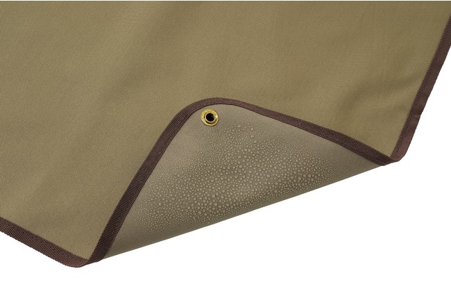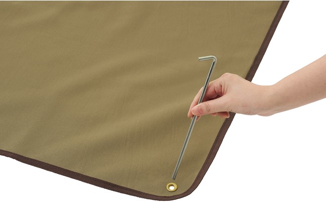 四隅にグロメットを設けており、ペグで固定して使用できるので便利です。裏面には防水性のあるPVCコーティングを施しており、テントの下に敷いてフロアシートとして使用すれば、テントの汚れや摩擦を軽減できるうえ、地面からの浸水や湿気を防ぐことができるので、快適に過ごせます。