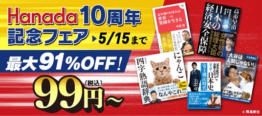 株式会社飛鳥新社(本社:東京都千代田区一ツ橋、代表取締役社長:土井尚久)は、4月の電子書籍キャンペーンとして「月刊Hanada創刊10周年記念フェア 最大91%オフ!99円(税込)~」を実施いたします。
