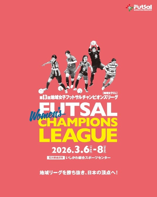 13回地域女子フットサルチャンピオンズリーグを2026年3月6日(金)~8日(日)の3日間、石川県金沢市のいしかわ総合スポーツセンターにて開催いたします。