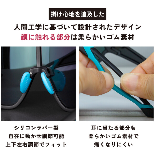 偏光レンズにすることで眩しさを抑えクリアな視界を確保し目の疲れを防止。