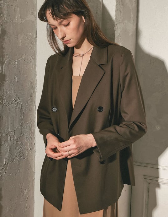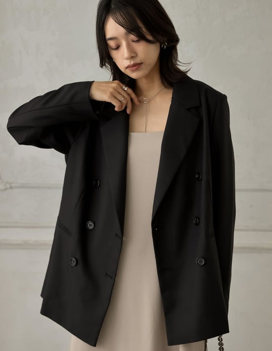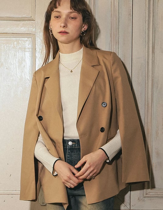 クラシックなダブルボタンのデザインに、トレンドを取り入れたスリットスリーブが特徴のテーラードジャケット。