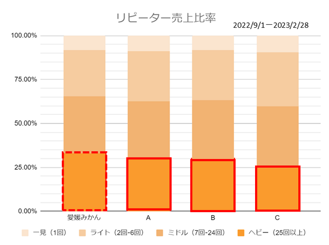 ※愛媛みかんを25回以上購入したお客さま(ヘビーリピーター)の売上比率は32.9%と、他商品と比較し高い数値となっている。<2022年9月1日~2023年2月28日で算出>