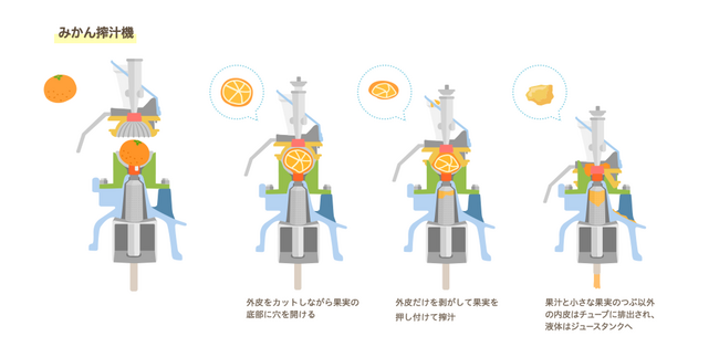 自然の恵みをたっぷり受けて育った愛媛県産温州みかんを100%使用したアキュアメイドの「愛媛みかん」。そのおいしさを余すところなくジュースに詰め込む―その秘密がみかんの搾り方に隠されています。みかんは皮と一緒に搾ると皮の果皮油分と果汁が混ざってしまい、果実本来のおいしさが出にくいので、「愛媛みかん」では、外皮部と果肉部を別々に分けて果肉だけ搾る「インライン式搾汁機」を採用。温州みかんならではの甘み×酸味のハーモニーを存分に味わえる贅沢なジュースに仕上がっています。