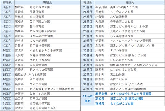 寄贈先は31都道府県43園になります。青字は今回寄贈が決定した園です。