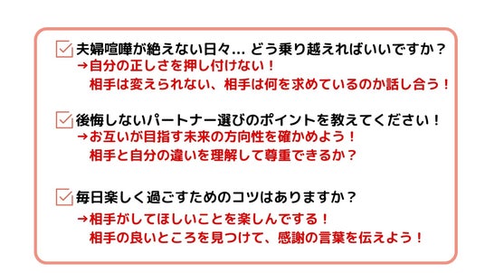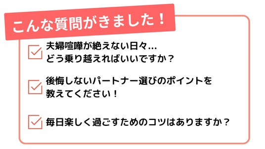 参加者からは下記のような夫婦関係にまつわるリアルな質問が多く寄せられました。
