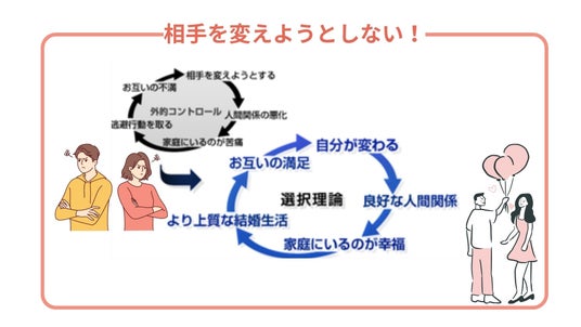 選択理論心理学に基づいた「よい夫婦関係のつくり方」はもちろん、よい夫婦関係のちょっとしたコツや、具体例を用いた実践的な内容もご紹介。