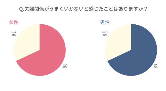 株式会社はぐくみプラスが400人の男女に行った「夫婦関係について」のアンケートによると、男女ともに68%が「夫婦関係がうまくいかない」と思ったことがあると回答。