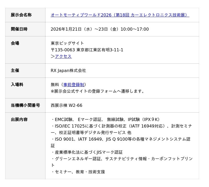 一般財団法人日本品質保証機構(本部:東京都千代田区、理事長:石井 裕晶)は、2026年1月21日(水)~23日(金)に東京ビッグサイトにて開催されます「オートモーティブワールド2026(第18回 カーエレクトロニクス技術展)」に出展いたします。