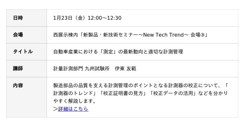 23日(金)には、西展示棟内で開催される「新製品・新技術セミナー」に登壇いたします。自動車業界の最新動向について専門性を持った講師が解説いたしますので、情報収集の場としてご活用ください。