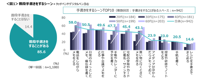 普段、手書きをすることがある人の割合は85.6%。手書きをするシーンで最も多いのは「電話をしながらメモをとる」で49.6%。<図1>