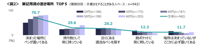 置き場所は7割が「決まった場所にペンが置いてある」と回答。世代があがるほど筆記用具の”定位置”がある。<図2>