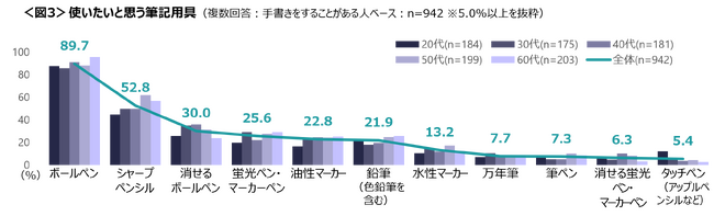 使いたい筆記用具は、「ボールペン」が約9割で突出。「シャープペンシル」が5割で続く。<図3>