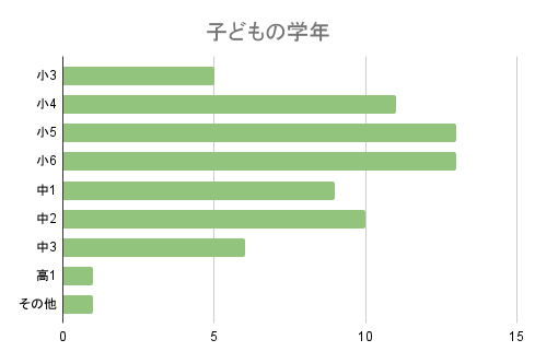 回答した69家庭の子どもの人数は、小学5年生・6年生がそれぞれ13人と一番のボリュームゾーンになっており、以下小4(11人)、中2(10人)、中1(9人)と続いています。