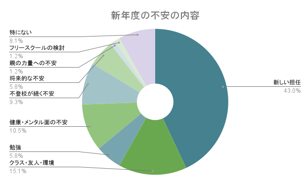 新年度を迎えるうえでの保護者の不安のうち最も多くの割合を占めたのは「新しい担任」で43%でした(重複回答あり)。