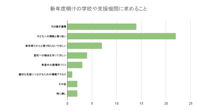 次に多かったのが、「引き継ぎ連携」であることからも、クラスの担任が変更するにあたって、前年度まで理解・考慮してもらっていた不登校の状況が、理解されずに対応されてしまうことを心配していることが予想されます。