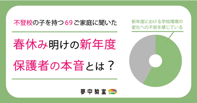不登校専門のオンライン家庭教師 夢中教室WOW!を展開するワオフル株式会社(所在地:福岡県福岡市 代表:辻田寛明)は、不登校の子を持つ69名の家庭を対象に、春休み明けの新年度の関する悩みや困りごとについてアンケート調査を実施し、結果を公表しました。