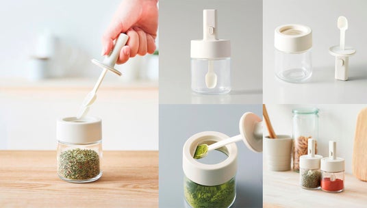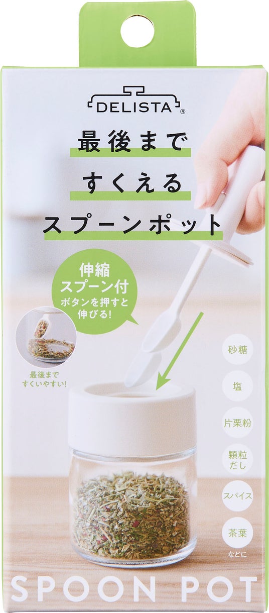 フタとスプーンが一体になったスパイスポット。中身が少なくなっても、ボタンを押すとスプーンが伸びて、底まですくいやすく。フチにすり切りパーツが付いているので量をはかるのにも便利です。フタになるスプーンには湿気を防止するパッキン付。