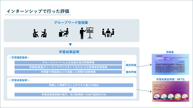 「これまでインターンシップに参加したと言う事しか示すことができなかったが、インターンシップをとおして評価された能力を、NFTを利用して証明する形で企業に示せる点が、学チカを証明する先進的な手段であると思った。」
