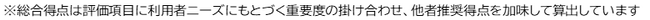 総合ランキングは、評価項目別に細分化したそのサービスの満足度評価と、「どの程度その企業のサービスを友人・知人に推奨したいか」を聞いた他者推奨意向を掛け合わせた得点をもとに順位付けしています。