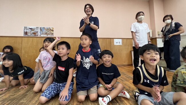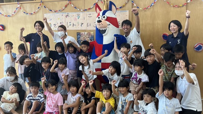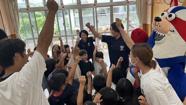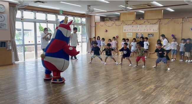 7月14日(金)に「おおきなわ」の活動の一環として、キングスのマスコットのゴーディーが豊見城市にある『ゆたか認定こども園』を訪問し、5歳児の園児たち27名と交流会を実施しました。