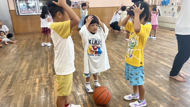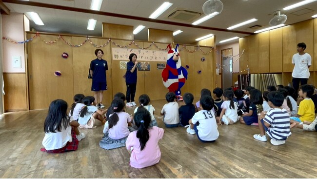 交流会では、キングスやゴーディーにまつわるクイズや、グループでのパス回し、教室内で手を繋いでゴーディーに触られずにゴールを目指すなど、ボール遊びを通してチームワークの大切さや楽しさを体験しながら、園児たちと交流を深めました。