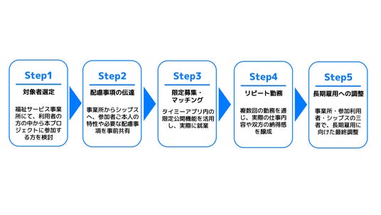 そこで本検証では、障がい者雇用にも積極的に取り組むシップスと共に、このような仮説や課題意識に基づき、スポットワークの「1日単位で、履歴書・面接なし」という特性を活かして、双方の不安や懸念を最小限に抑えながら「実際の仕事」を体験する場を提供していくことを目指します。これにより、双方の理解を深め、最終的にはミスマッチの少ない安定的な雇用への移行を目指します。