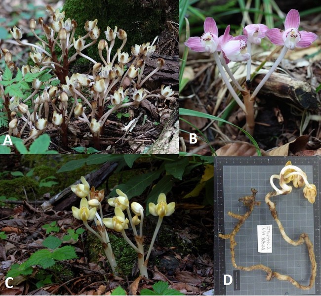 ショウキラン属3種の花(A: キバナノショウキラン、B: ショウキラン、C: シナノショウキラン)。シナノショウキランの花と根茎(D)。菌から栄養を獲得して生きる特異な進化を遂げたため、葉は退化してしまい光合成を行わない。地下の根茎に菌が共生する。