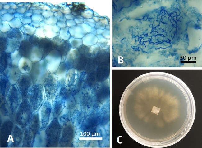 ショウキラン属の根茎から見出された共生菌 (A)とその拡大(B)。PDA培地で培養された菌株(C)