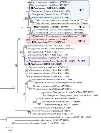 ショウキラン属と共生する菌Physisporinus属の系統樹。OTU1、OTU2、OTU3、OTU4と仮称した種が、ショウキラン属と共生することが明らかになった。