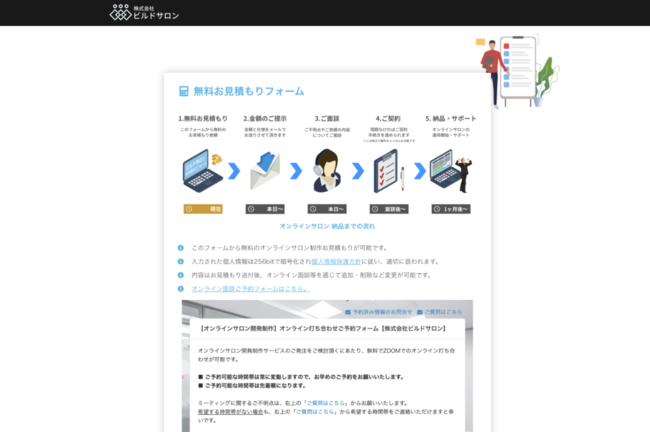ビルドサロンの無料お見積もりフォーム( https://buildsalon.co.jp/estimate )にアクセスし、必要項目を埋めて送信してください。