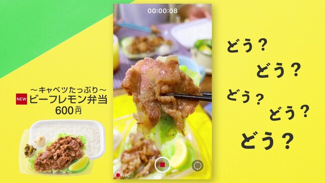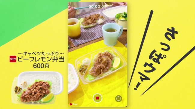 友人同士の賑やかな食事シーンの中で、スマホで撮影する様子や、会話を通して『~キャベツたっぷり~ビーフレモン弁当』の魅力を訴求しています。主人公がレモンを絞り、お肉を口に運ぶと、思わず「さっぱウマ!」と声を出してしまいます。その後の「さっぱりと美味いね!」という友人とのやり取りが、楽しさを演出しています。こちらのCMは実際にスマホで撮影した映像をそのまま使用することで、リアルな表現にこだわりました。