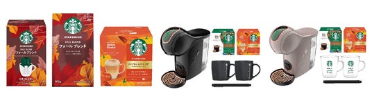 画像(左より):「スターバックス オリガミ(R) パーソナルドリップ(R) コーヒー フォール ブレンド 4袋」、「スターバックス(R) コーヒー フォール ブレンド 140g (粉)」、「スターバックス(R) パンプキン スパイス ラテ ネスカフェ ドルチェ グスト専用カプセル 12P (6杯分)」、「ネスカフェ ドルチェ グスト GENIO S SHARE ブラック スターバックス(R) フォール 体験セット」、「ネスカフェ ドルチェ グスト GENIO S SHARE モカローズ スターバックス(R) フォール 体験セット」
