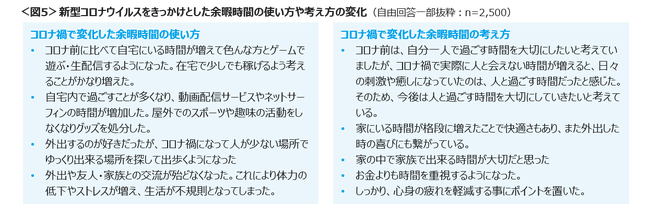 コロナ禍により余暇時間の使い方の変化では、「動画配信やゲームの時間が増えた」「人の少ない場所を探して出歩いた」、考え方の変化は「人と過ごす時間が大切だと実感」「お金より時間重視になった」などの声があがった。<図5>