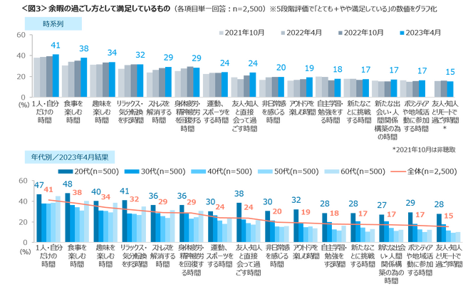 余暇の過ごし方としては「1人・自分だけの時間」「食事を楽しむ時間」「趣味を楽しむ時間」の満足度が高い。時系列で見ると大半の項目で上昇傾向にある。20代においては、運動をする・人と会う・非日常を感じる・アウトドアをするなど多くの場面での満足度が高く、余暇時間を満喫している様子がうかがえる。特に「友人・知人と直接会って過ごす時間」は、突出して高い。<図3>