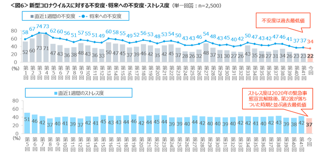 定点指標の「直近1週間の不安度」と「将来に対する不安度」は、先月からは微減の過去最低値。「直近1週間のストレス度」は、先月から5p減の37%と2020年の1回目の緊急事態宣言解除後と第2波が落ちついた時期の結果と並ぶ最低値であった。<図6>