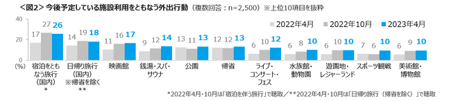 GWも含む今後の予定では「宿泊をともなう旅行(国内)」が26%、「帰省を除く日帰り旅行」が18%と旅行の予定が高く、次いで「映画館」が17%であった。<図2>