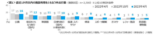 直近1か月間の外出は、「公園」「宿泊をともなう旅行(国内)」「映画館」「帰省を除く日帰り旅行」で1割を超えた。「映画館」「銭湯・スパ・サウナ」「帰省」「スポーツ観戦」などへのお出かけは、ゆるい上昇傾向にある。<図1>