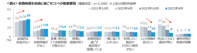 余暇時間を自由に過ごすことへの阻害要因は、「金銭的な余裕がない」が39%と最も多く、次いで「平日の余暇時間が少ない」の18%であり、いずれも上昇傾向。「家事・育児などで余暇時間がとれない」人は14%と一定数存在する。一方、コロナが要因となる「人との接触を控えたい」「外出にともなう感染が怖い」は大幅な低下。<図4>