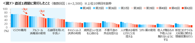 直近1週間で行った感染症対策は、低下傾向が続いているものの「マスクの着用」と「アルコール消毒液の使用」は5~6割の人が行っている。<図7>