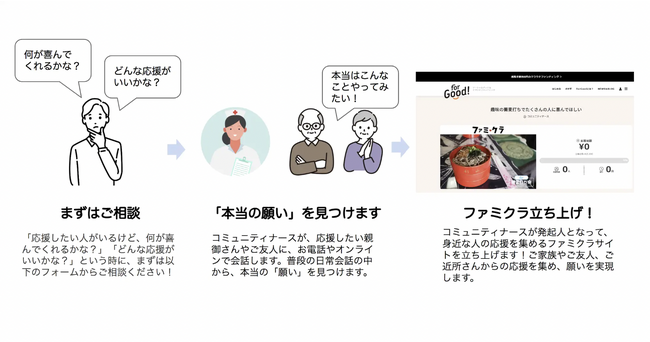 そこで、この度For Goodは、ご家族など身近な人たちに代わってコミュニティナースのような第三者が「楽しみ」や「生きがい」を見つけ、身近な人たちから応援を届けられる仕組みとして、CNCと連携し、ファミリークラウドファンディングを開発いたしました。