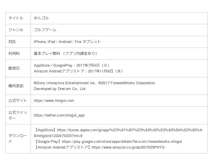 『みんゴル』は、「プレイステーション」を代表する作品のひとつ「みんなのGOLF」シリーズの“誰でも簡単にゴルフゲームを楽しめる”というコンセプトを、スマートフォンの特性や、プレイスタイルに合わせて最適化し、誰もが、いつでもどこでも、爽快ショットで手軽にゴルフゲームをお楽しみいただけます。