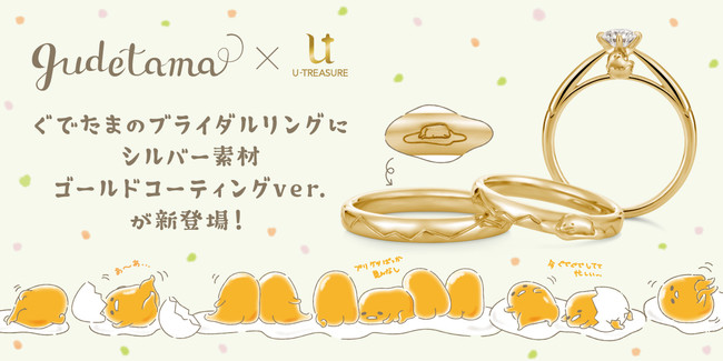 大人のための本格的なキャラクタージュエリーを扱うユートレジャー(東京都豊島区:代表取締役:伊藤 崇史)は、株式会社サンリオの「ぐでたま」をモチーフにしたブライダルリング(指輪)3種類を、6月9日(木)~7月8日(金)の期間限定で予約受付を行ないます。このたびの新作は、イエローゴールドコーティングを施したシルバー素材で、ファッションアイテムとしても身につけやすいタイプです。ぐでたまが宝石を支えるソリティアタイプの婚約指輪と、たまごの殻のつなぎ目をデザインした結婚指輪です。ユートレジャーコンセプトストア池袋、ユートレジャーオンラインショップにて取り扱います。