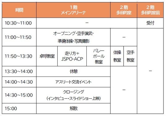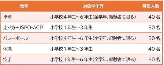 著名なアスリートが講師となり、卓球、バレーボール、走り方+JSPO-ACP、体操、空手の各教室を、小学生を対象に開催します(事前申込制)。