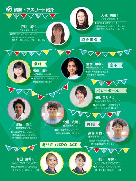 本イベントには、東京2020オリンピックなどで活躍されたアスリートを始め、多くの著名アスリートの方々に講師として参加いただき、様々なスポーツ体験教室を実施いたします。
