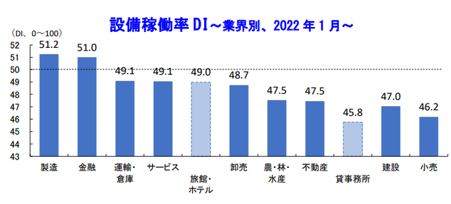 帝国データバンク「TDB景気動向調査」で算出している2022年1月の設備稼働率DI[1]は49.3となり、3カ月ぶりに50を下回りました。新型コロナショックにより企業の設備稼働が急激に停滞した状況から戻りつつあったなかで、オミクロン株の感染拡大が企業の生産活動にブレーキをかけた格好となっています。