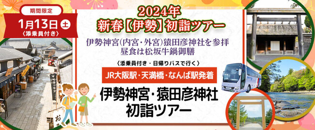 株式会社フォーティーズ(本社:大阪市鶴見区、代表取締役 岡武史)は、おひとり様13,800円 1月13日(土) 【三重・伊勢】〈大阪駅・天満橋・なんば発着・添乗員付き〉2024年新春【伊勢】初詣!「伊勢神宮内宮・下宮」両詣り+「猿田彦神社」ご参拝+松坂牛鍋のご昼食+おはらい町・おかげ横丁でお買い物 日帰りバスツアーのオンライン販売を開始しました。